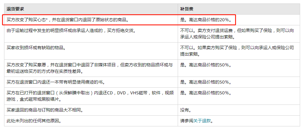 第二个退货政策变化针对的是“补货费”。当顾客进行退货时,卖家可以根据退回货物的状态,只退部分货款给买家。这扣掉没有退的这部分费用就是补货费。