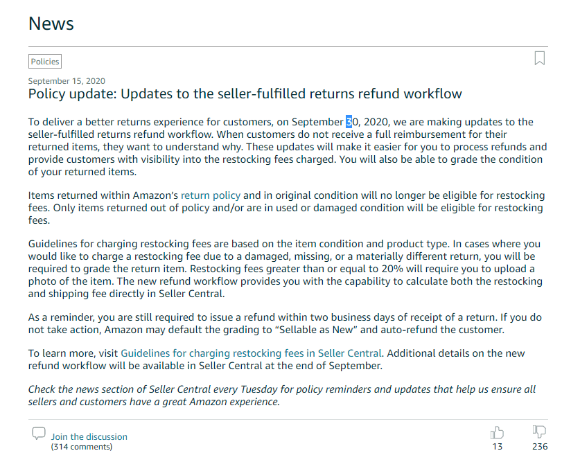 这个政策将会从9月30日开始生效,正好和上面一个延长退货期的政策(10月1日生效)衔接上,而且亚马逊连续发布了这两个改动,很明显这两个改动就是一体的,一边取消了买家退货(货物完整)的补货费成本,一边延长了买家可以退货的时限,就是要让消费者可以在今年旺季肆无忌惮地购物,如果反悔了也可以随便退货拿回全部退款。