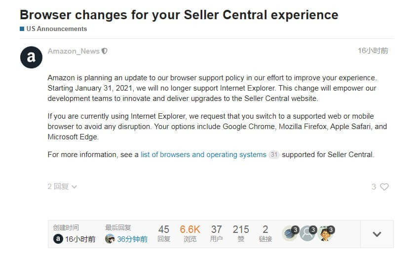 10月14日,亚马逊美国站后台公布一则有关浏览器支持变更的公告。公告原文如下: