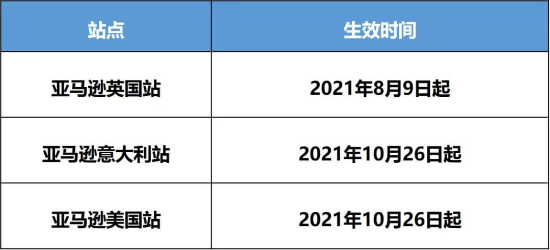 免费退货被认为是时尚品类商品的销售标准,在此之前,亚马逊已经为时尚品类商品的亚马逊物流(FBA)配送订单提供免费退货服务。现在,在亚马逊英国、意大利和美国站,使用 卖家自配送(MFN/FBM)方式销售时尚品类商品时(即“服装”“鞋靴”“珠宝首饰”或“钟表”),卖家也需要为买家提供免费退货服务,即您需要为买家支付退货运费。您可以参照下表了解各站点具体生效时间: